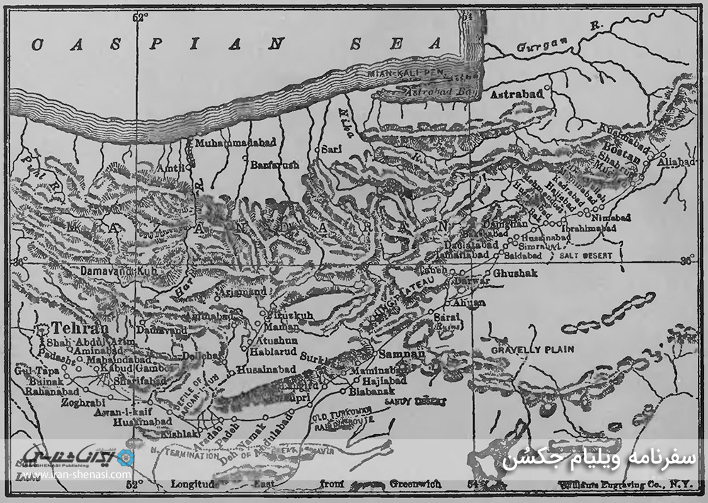 جکسن پس از خروج از تهران و عبور از کنار ویرانههای ری باستانی و برج خاموشان، وارد جادۀ خراسان شده و مسیری که در آن اسکندر به تعقیب داریوش سوم پرداخته را در پیش گرفته است. در طی مسیر، پس از بازدید از ایوانکیف و قلعه ماری به گذرگاه سردره یا دروازههای کاسپین نزدیک شده و وقایع تاریخی تعقیب و گریز اسکندر و داریوش را با اشاره به برخی منابع کلاسیک روایت کرده است.