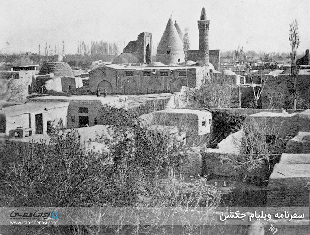 پس از خروج از دامغان، جکسن از کنار آبادیهای بُستَجان و قلعۀ بَق عبور کرده و در همان حوالی از دیدن یک صندوق نگهداری موقت جسد متعجب میشود. وی در ادامۀ مسیر خود به سوی بسطام و شاهرود ضمن اشاره به قناتهای فراوان و زمینهای حاصلخیز روستای مهماندوست، به چراییِ وجود برجهای نگهبانیِ گلینِ پرشمار در این منطقه پرداخته است. در بسطام به بازدید از بناهای مهم معماری شهر که در گرداگرد زیارتگاه تاریخی بایزید قرار گرفته پرداخته و به توصیف جزئیات دقیق یکایک آنها پرداخته است.